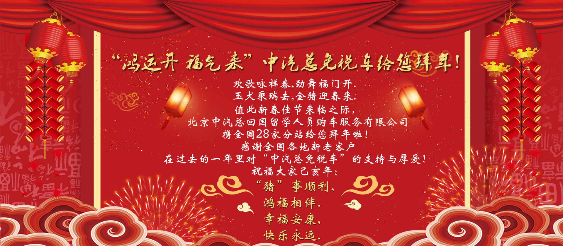 值此新春佳节来临之际,北京中汽总回国留学人员购车服务有限公司携全国28家分站给您拜年啦!感谢全国各地留学生朋友们在过去的一年里对“中汽总免税车”的支持与厚爱!祝福大家己亥年:“猪”事顺利!