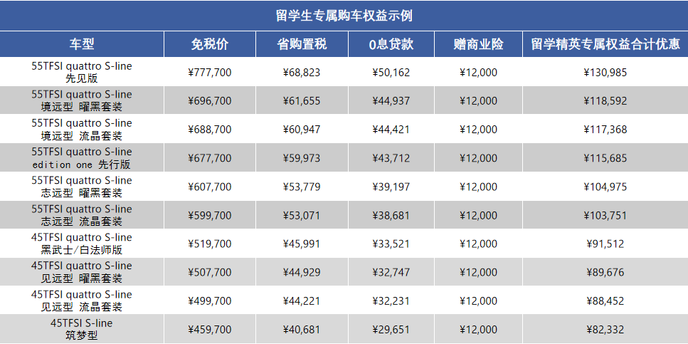 1、同学们期待已久的A7L如期而至,不光是全免车辆购置税,更享受超多留学生专属购车权益(尊享用车礼、驭享出行礼、畅享互联礼、先行版独享奢享定制礼;首年免费商业险,含车损险+三者200万;24期0息金融分期方案,首付30%)。