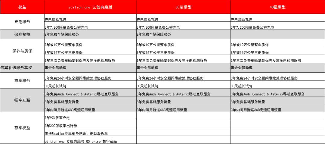3、尊享用车礼遇:45TFSI全系赠送基础权益包,55TFSI车型尊享十八重尊享/领尊权益